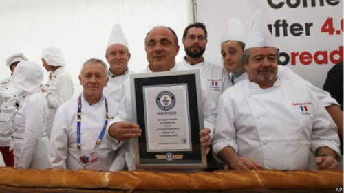 據(jù)悉,這個法式長棍面包是由60名面包師,辛苦工作將近7個小時完成的。