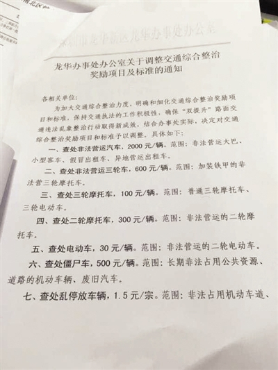 記者在一份由深圳龍華新區(qū)龍華辦事處辦公室出具的《關(guān)于調(diào)整交通綜合整治獎(jiǎng)勵(lì)項(xiàng)目及標(biāo)準(zhǔn)的通知》的文件中發(fā)現(xiàn),為加大交通綜合整治力度,明確和細(xì)化交通綜合整治獎(jiǎng)勵(lì)項(xiàng)目和標(biāo)準(zhǔn),保持交通執(zhí)法的工作積極性,辦事處決定對交通綜合整治獎(jiǎng)勵(lì)項(xiàng)目和標(biāo)準(zhǔn)予以調(diào)整,其中加裝鐵甲的非法營運(yùn)三輪車每查處一輛獎(jiǎng)勵(lì)600元,普通三輪摩托車、三輪電動(dòng)車每輛獎(jiǎng)勵(lì)100元,對無證駕駛、妨礙執(zhí)法當(dāng)事人實(shí)施行政拘留的,拘留一人獎(jiǎng)勵(lì)500元。
