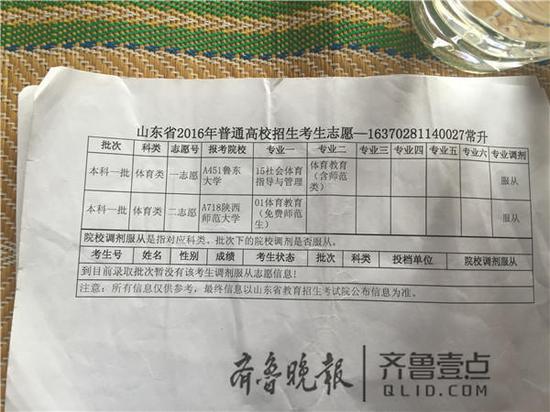 陜西師范大學(xué)在山東招收6名體育教育專業(yè)的學(xué)生,均為免費師范生。第一志愿的錄取線為文化課362分,專業(yè)課66.54分。學(xué)校按照專業(yè)課成績由高到低擇優(yōu)錄取。常升的文化課考了403分,專業(yè)課考了93.64分,遠(yuǎn)超出學(xué)校的錄取線。而魯東大學(xué)官網(wǎng)顯示,該校社會體育指導(dǎo)與管理專業(yè)的文化課最低錄取分?jǐn)?shù)為407分,而常升的文化課成績差4分。不過,該校對專業(yè)課要求低,專業(yè)課成績最高分僅為77.65分。