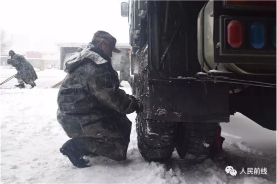 ▲第71集團(tuán)軍某合成旅迅速啟動(dòng)應(yīng)急方案,檢查并禁錮車輛防滑鏈。