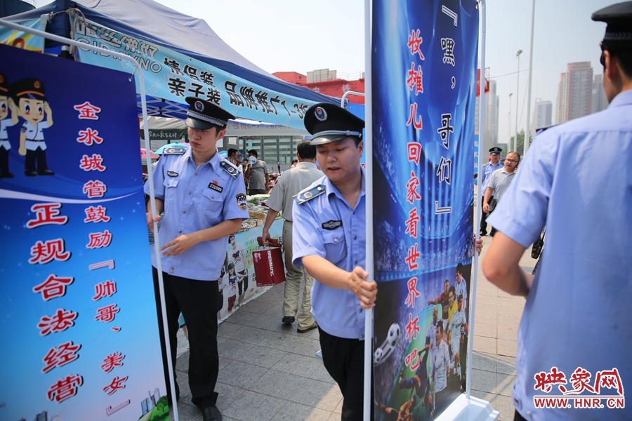 映象網(wǎng)訊 (記者 閆善良 文/圖)“你家人造(知道)嗎?”、“西班牙、英格蘭都回家了。哥們......咱也不在這添堵啦!”、“哥、姐,嫩(你們)別給這兒添堵啦。”、“嘿,哥們!收攤兒回家看世界杯吧!”、“帥哥、美女,正規(guī)合法經(jīng)營(yíng)?!薄ⅰ敖鹚枪芨嬷?,醬紫(這樣子)不合適。”7月2日上午10時(shí)20分,鄭州市紫荊山地鐵站出入口,用網(wǎng)絡(luò)流行語(yǔ)寫(xiě)成的十多塊宣傳板,呈弧形圍在一個(gè)占道經(jīng)營(yíng)商販的周圍,引來(lái)眾多市民圍觀。