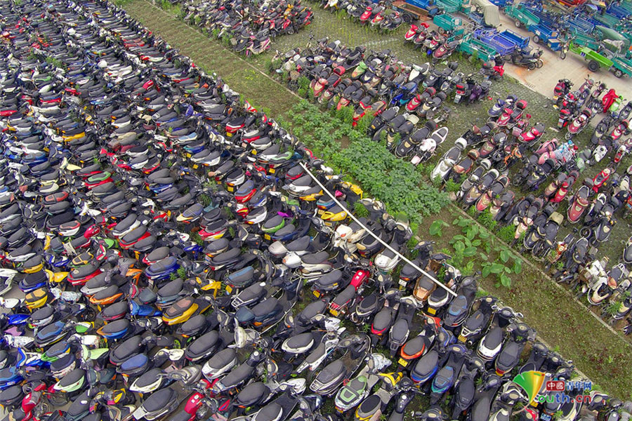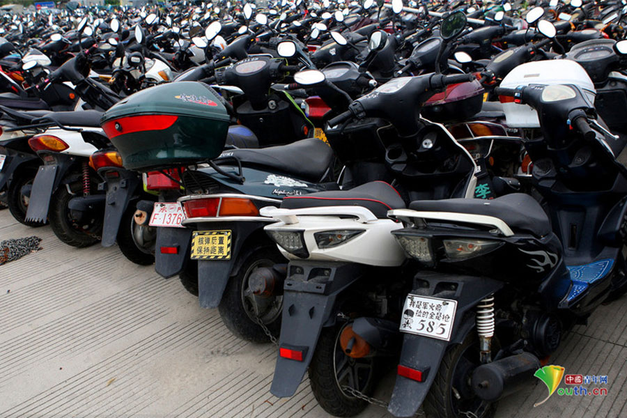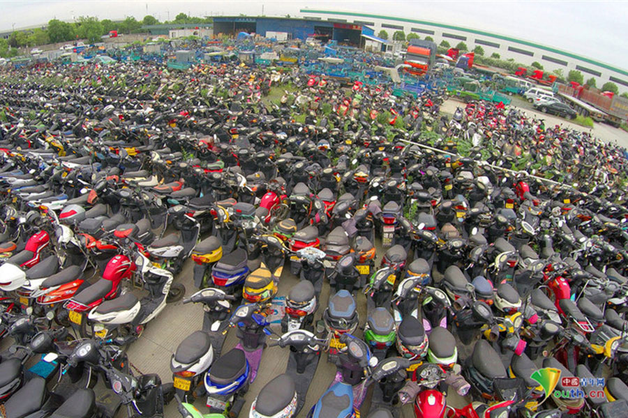 2015年6月4日,超寬、超速、非法營運(yùn)三輪電摩及各種摩托車密密麻麻重重疊疊地堆積在一起,從高空中俯瞰場面震撼。這不只是杭州一家報廢車停車場的情景,幾乎每家停車場都如此。工作人員說,這都是交警執(zhí)法過程中收繳的。工作人員跟記者抱怨說,電摩停放時間太長,再不拆解都停不下了!據(jù)負(fù)責(zé)人介紹,杭州自禁摩托車以來,總有一些違規(guī)者偷偷地利用摩托車充當(dāng)黑摩的。此舉既不安全,也暗藏各種不安全因素。2014年,杭州有204人死于涉及電瓶車的交通事故;在所有交通事故中,涉及電瓶車的占到四成以上。3月25日,有杭州媒體報道,杭州收繳的電動車已堆滿停車場,據(jù)估算馬路上還有百萬輛以上超標(biāo)車。(金童子/攝)
