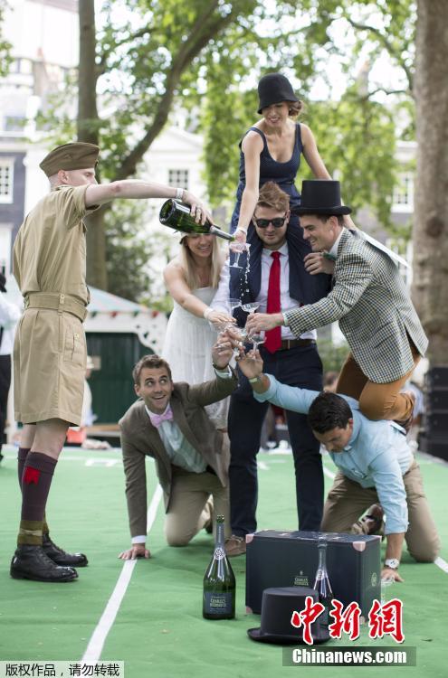 當?shù)貢r間2015年7月11日,英國倫敦,貝德福德廣場花園舉辦一年一度的“紳士運動會”。這是一個不以打破記錄為榮,而專為紳士打扮裝帥??岫O的趣味運動會,比賽項目包括“雨傘騎(車)斗”、“燙衣板沖浪”、“背人賽跑”等,現(xiàn)場參加者不一定會出汗出力,但一定要打扮成傳統(tǒng)紳士淑女風格,而叼煙、小酌一杯的鏡頭更讓人覺得這是一場嘉年華。