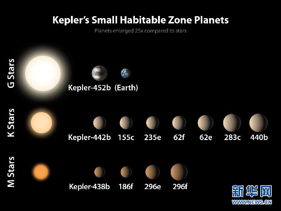這張美國航天局7月23日公布的效果圖顯示的是新發(fā)現(xiàn)的12顆宜居帶行星,其中上右為地球,上左為太陽系外行星開普勒-452b。美國航天局23日在音頻新聞發(fā)布會上宣布,天文學(xué)家通過開普勒太空望遠鏡確認在宜居帶發(fā)現(xiàn)第一顆與地球大小相似的太陽系外行星開普勒-452b。新華社發(fā)