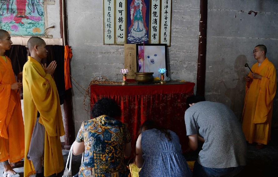 周近夏認(rèn)為,自己的服務(wù)理念賣(mài)的是火化之外的事情,追悼?jī)x式就是其中之一。從2011年成立釋友寵物殯葬至今,不少名人通過(guò)口口相傳找到周近夏的店為自己的寵物處理后事。圖為寵物狗的遺像被擺放在寺廟中。