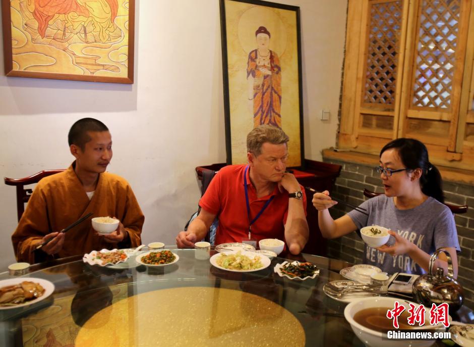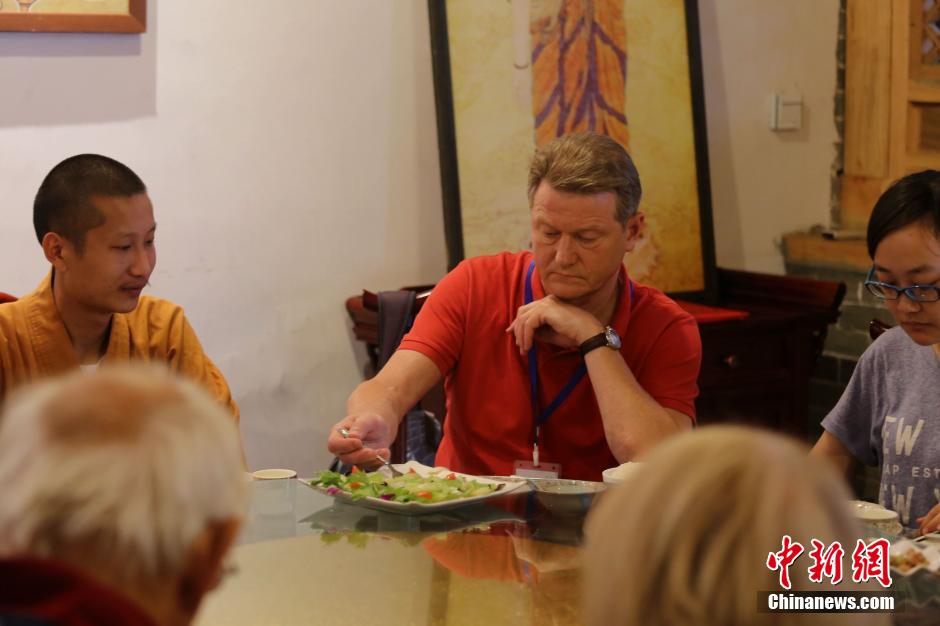 9月20日,河南登封少林寺,立陶宛前總統(tǒng)、現(xiàn)歐盟議員、國(guó)際特技飛行員羅蘭達(dá)斯·帕克薩斯與參加2015鄭州航展的明星隊(duì)員們參訪少林寺。羅蘭達(dá)斯在少林寺里吃齋飯。中新社發(fā) 王中舉 攝