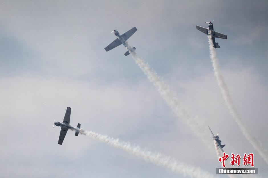 9月24日,河南鄭州上街機(jī)場(chǎng),參加2015鄭州航展的特技飛行員們,穿云破霧在加緊練習(xí)表演動(dòng)作,沖刺9月25日開幕的鄭州航展。中新社記者 王中舉 攝