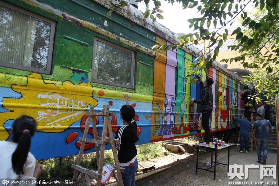 2015年10月10日,鄭州四禾美術中學充分發(fā)揮美術生的優(yōu)勢,對火車車身1進行涂鴉改造,使火車宿舍看起來更加漂亮。