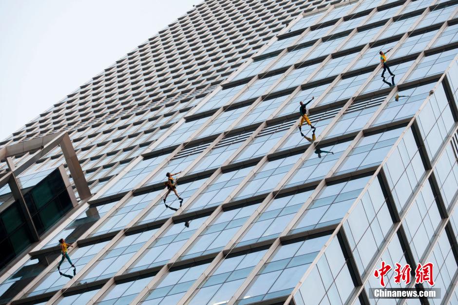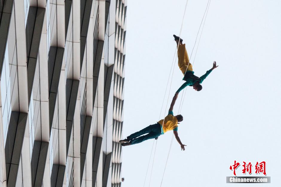 10月15日,美國BANDALOOP高空舞蹈團“空中芭蕾”中國內地首秀空降上海街頭,4名高空舞者在80米高的玻璃幕墻上翩翩起舞,舞蹈之美和力量之美在云端融合。中新社記者 張亨偉 攝