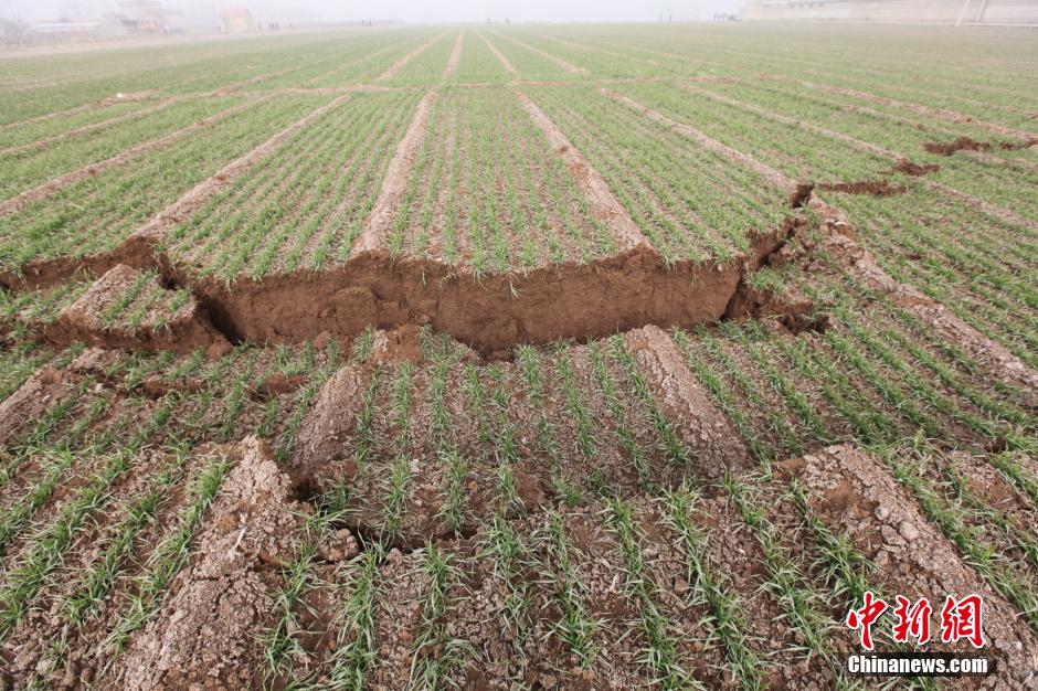 12月25日,山東平邑,位于平邑縣保太鎮(zhèn)的玉榮商貿(mào)有限公司石膏礦發(fā)生坍塌事故。圖為礦區(qū)塌陷的麥田。視覺(jué)中國(guó)供圖