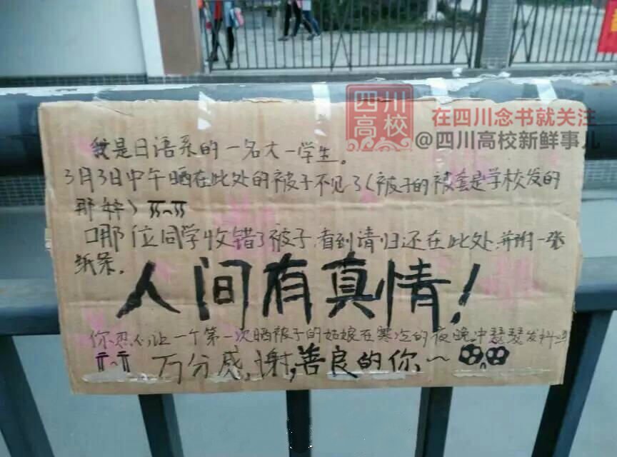 近日,四川外國語大學(xué)成都學(xué)院一女生在校內(nèi)曬的被子被其他同學(xué)誤拿,這位女生通過“人間有真情”海報、一系列“請往右看”便簽來定位一床沒人收的被子,以此尋找拿錯被子的同學(xué)。這個萌辦法讓網(wǎng)友紛紛點贊。