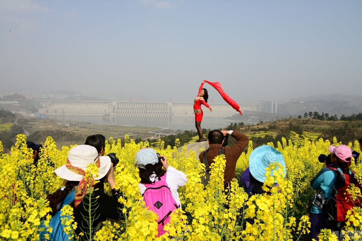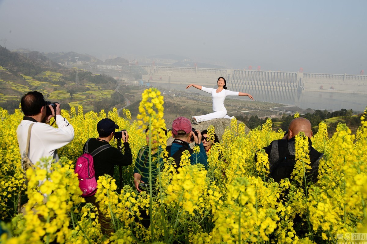 2016年3月6日,湖北宜昌,隨著春季氣溫的回升,湖北宜昌三峽壩區(qū)高家溪油菜花絢麗綻放,把三峽大壩映襯得分外壯觀美麗,吸引了眾多攝影發(fā)燒友和游人前來踏青采風(fēng)游覽。當(dāng)天一位練瑜伽的大媽陶醉于壩前花海,秀起了瑜伽,一時吸引了攝影發(fā)燒友和游人瘋狂拍攝。圖為大媽花海中秀瑜伽。