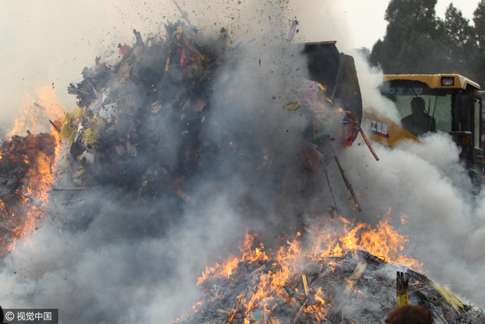祈?,F(xiàn)場,濃濃的煙霧讓人睜不開眼,兩輛大型鏟車不停地處理燃燒物,幾十個工作人員甚至用上了滅火器來處理殘留物。供圖:視覺中國