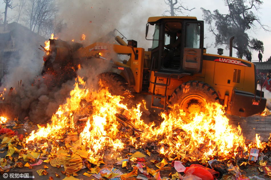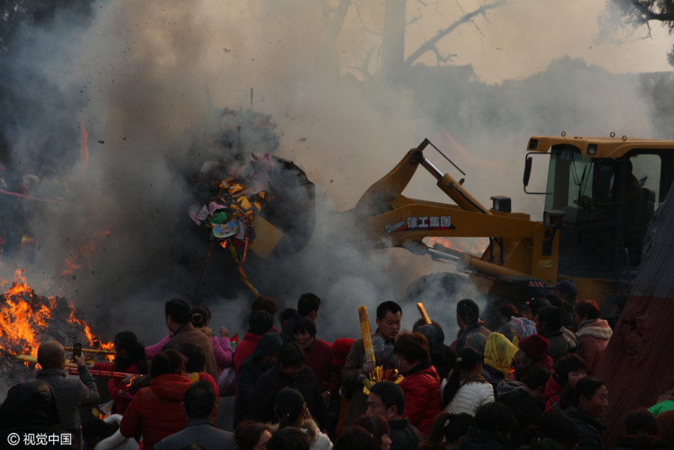 太昊陵廟會上燒高香的群眾和清理香火的鏟車。供圖:視覺中國