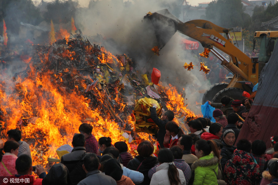 2016年3月10日,農(nóng)歷二月初二,在河南省淮陽縣舉辦的太昊陵古廟會上,大批香客涌入進香。盡管相關部門已貼出公告,要求愛護環(huán)境,禁燒高香。但仍有許多群眾燃香長度和直徑也明顯超出規(guī)定,燃燒的祭品堆成小山。供圖:視覺中國