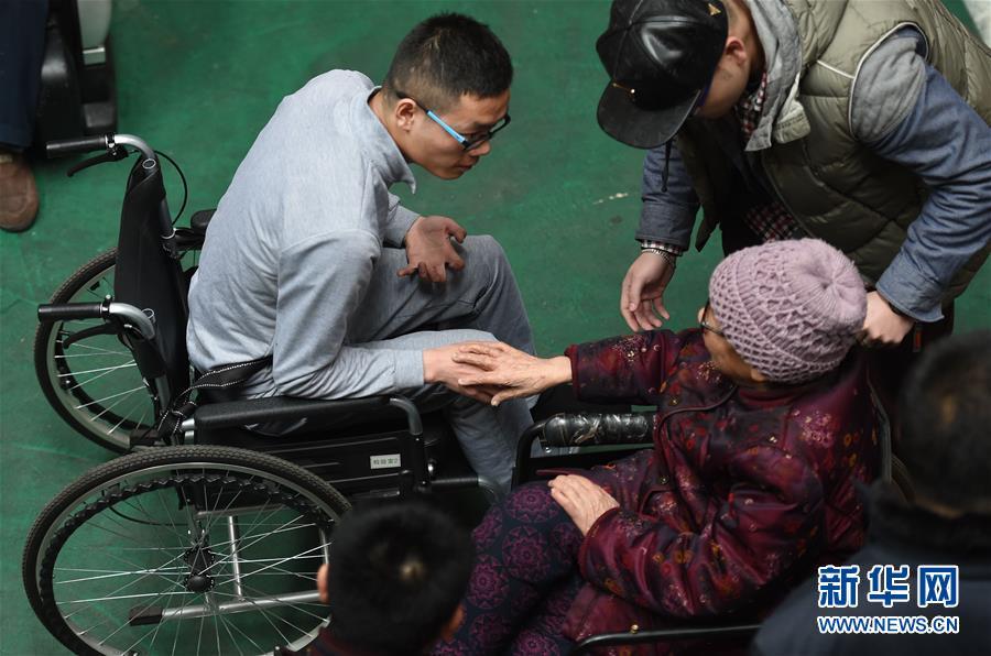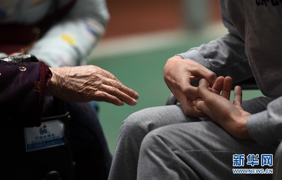 3月17日,奶奶與黃舸扮演者王峰見面后,伸出手準(zhǔn)備觸碰王峰的手,而王峰則保持著模仿肌營養(yǎng)不良患者的手型。新華社記者 李尕 攝 圖片來源:新華網(wǎng)