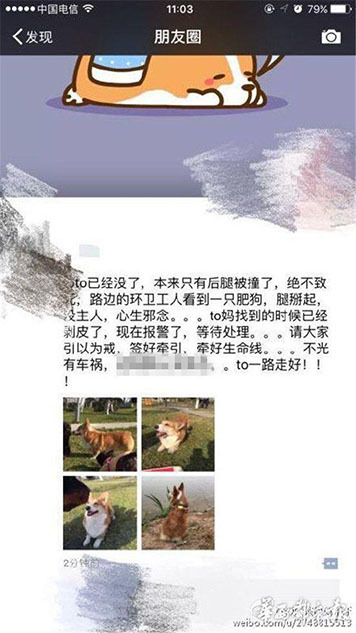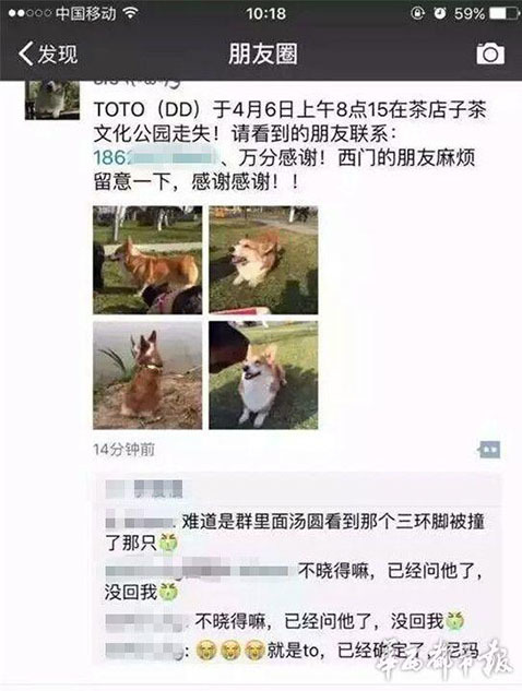 據(jù)主人李女士講述,“早上8點(diǎn)20分左右,我媽媽帶狗出去散步,它跟著別的狗跑丟了。我們找了很久?!崩钆空f(shuō),小狗跑丟后,在成都一愛(ài)寵微信群里,有群友稱在三環(huán)路上看到過(guò)它,“說(shuō)是它橫穿三環(huán)路,把后腿撞到了,它就沿著三環(huán)路跑了。”圖為李女士在朋友圈發(fā)布的尋狗信息。