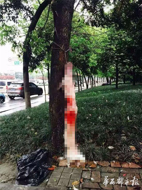 李女士一家順著三環(huán)路輔道一路尋找,最終在三環(huán)路的輔道上找到了TOTO,然而此時(shí)它已經(jīng)是一具尸體?!氨粧煸跇?shù)上,已經(jīng)被剝了皮。后腿確實(shí)有被車撞的痕跡?!闭f(shuō)到這里,李小姐在電話里哭了起來(lái),“我們到現(xiàn)場(chǎng)的時(shí)候,有一名環(huán)衛(wèi)工摸樣的人還正在剝皮!”
