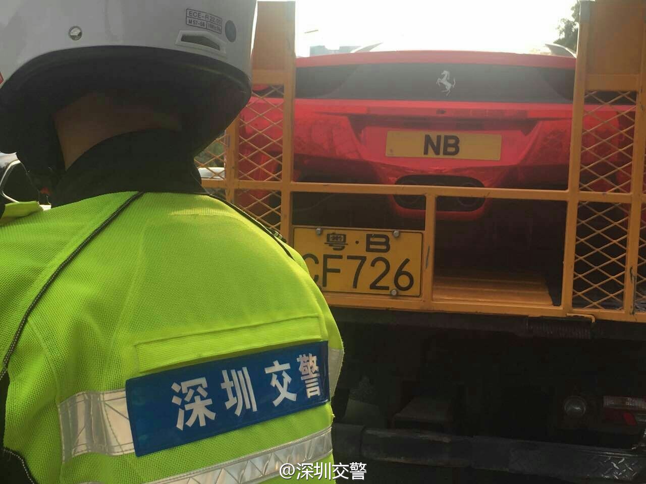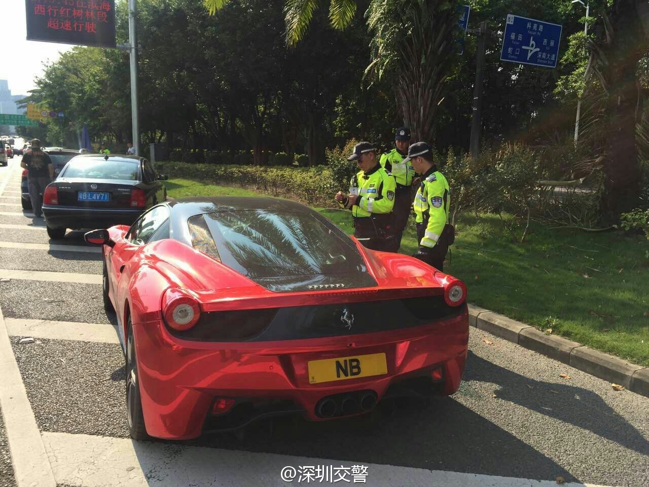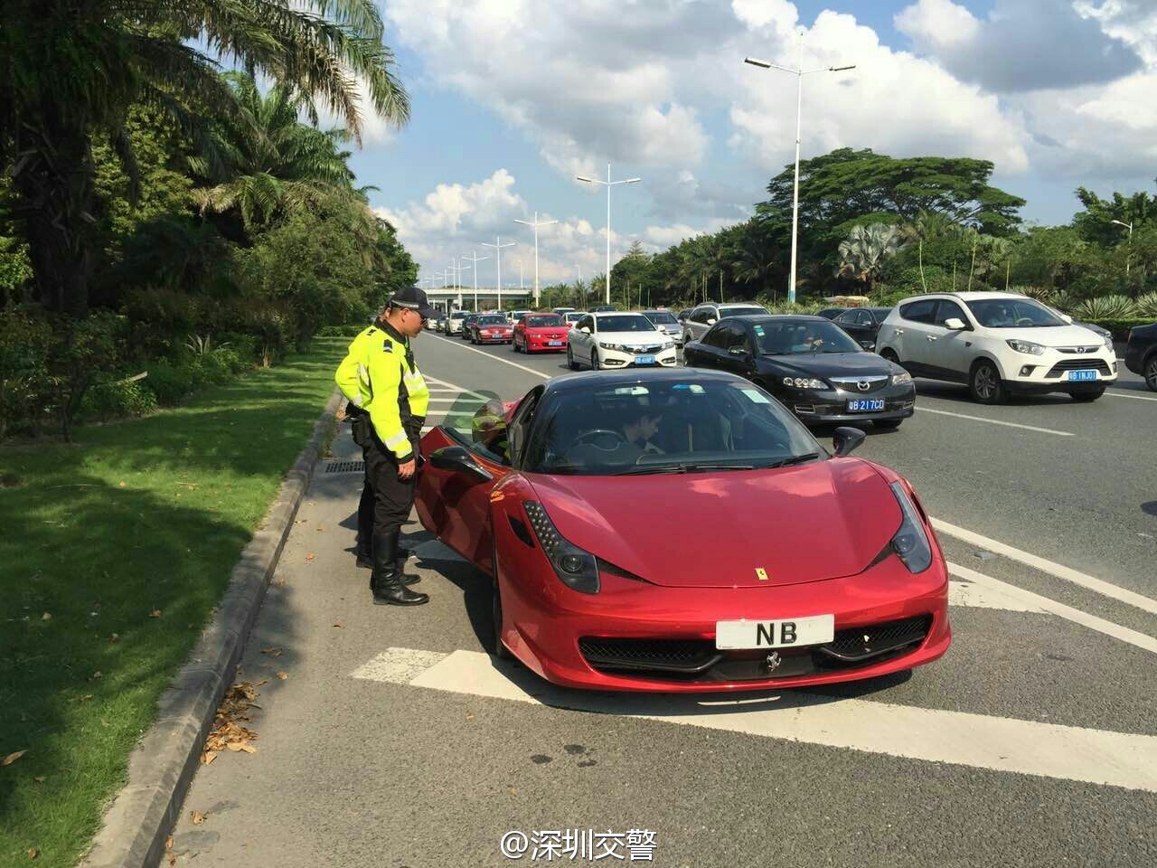 深圳交警5月7日17:16發(fā)布了一條微博:“當(dāng)鐵騎遇到他……”,同時(shí)配上四張圖片:只見(jiàn)一輛掛著“NB”車(chē)牌的紅色跑車(chē)被交警鐵騎攔下,最后被帶走。