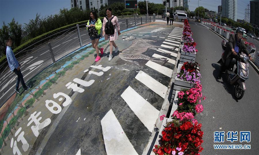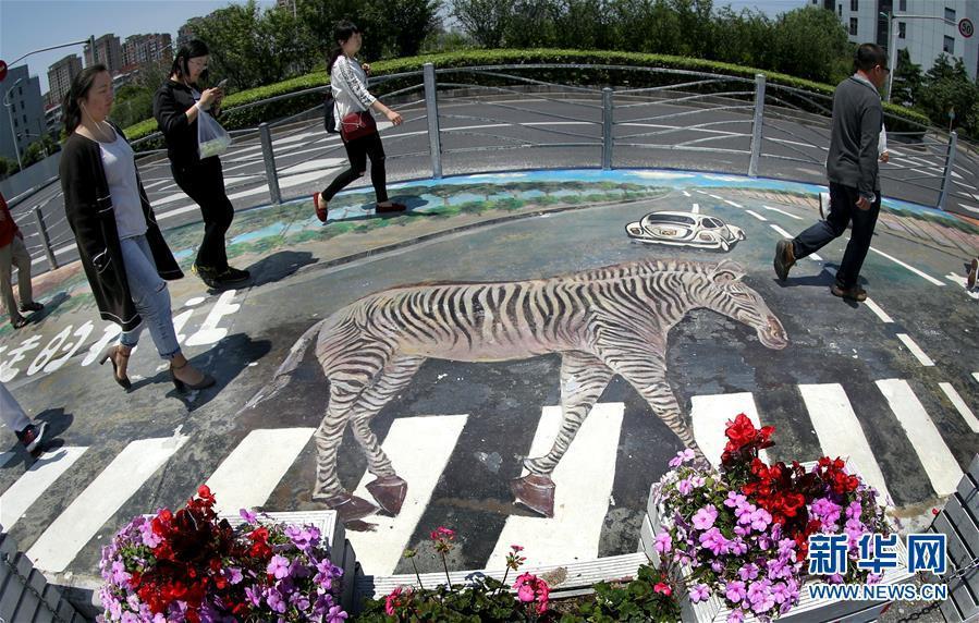 5月16日,行人從上海漕河涇開發(fā)區(qū)一處3D斑馬線上走過。近日,上海漕河涇開發(fā)區(qū)的一條人行橫道線變身一幅3D效果圖畫,還“植入”了宣傳行走禮讓的標語,呼吁文明出行。 新華社記者 凡軍 攝 圖片來源:新華網
