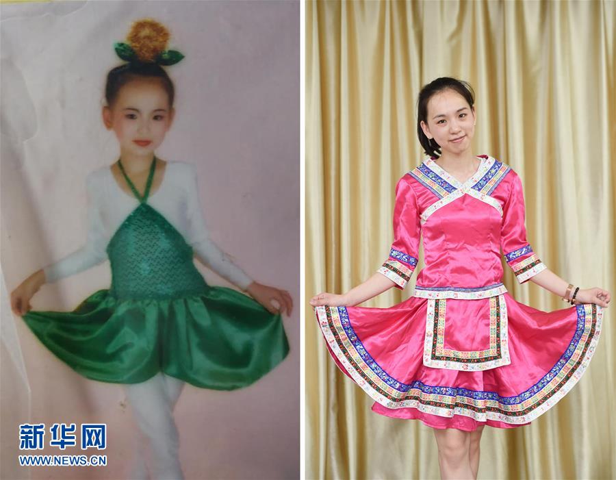左圖:姜春曉童年時表演節(jié)目(資料照片);右圖:5月27日,福建福州市聾啞學(xué)?!?0后”音樂老師姜春曉在為學(xué)?!傲弧惫?jié)目做準(zhǔn)備(新華社記者 宋為偉 攝)。新華社發(fā)