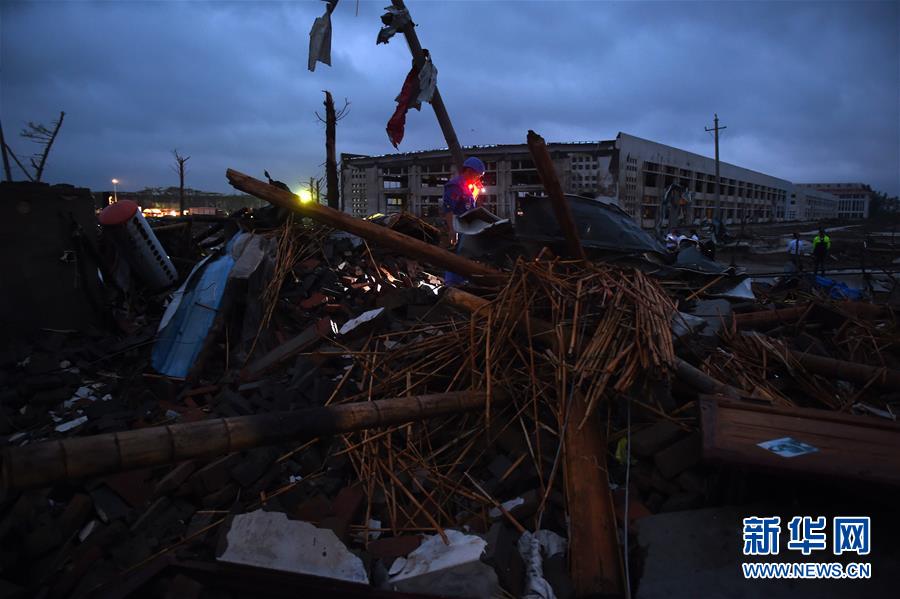 6月24日黎明,搜救人員在鹽城市阜寧經(jīng)濟(jì)開發(fā)區(qū)北陳村進(jìn)行排查搜救。新華社記者李響攝