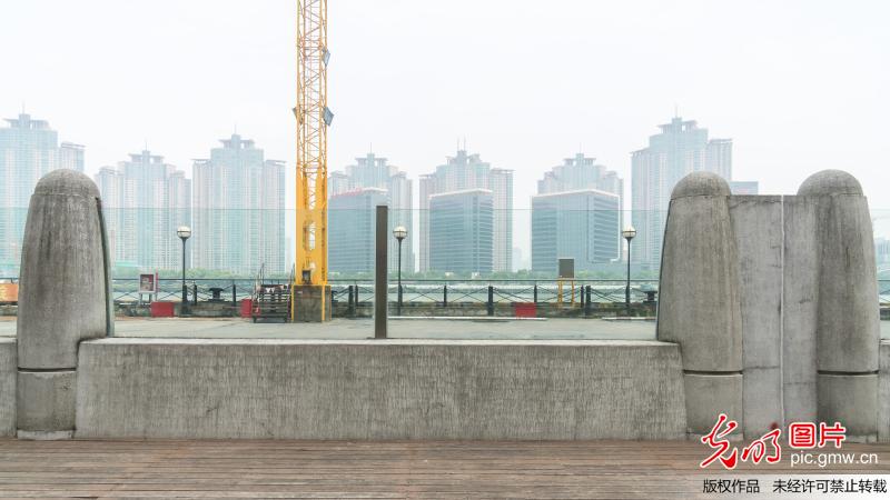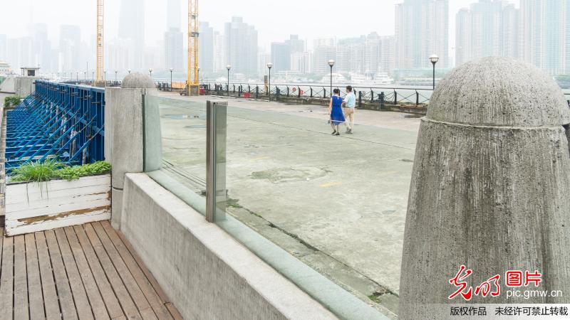 當(dāng)日中午,走訪南外灘老碼頭,見到這一長達(dá)數(shù)十米,由鋼筋混凝土墻體和通透式玻璃組合而成的"抗洪神器",其中雙層玻璃防汛墻的厚度達(dá)到18毫米,既滿足防汛擋水需要,同時(shí)方便游客坐在岸堤邊欣賞老碼頭和江岸景色。(王岡攝/光明圖片)
