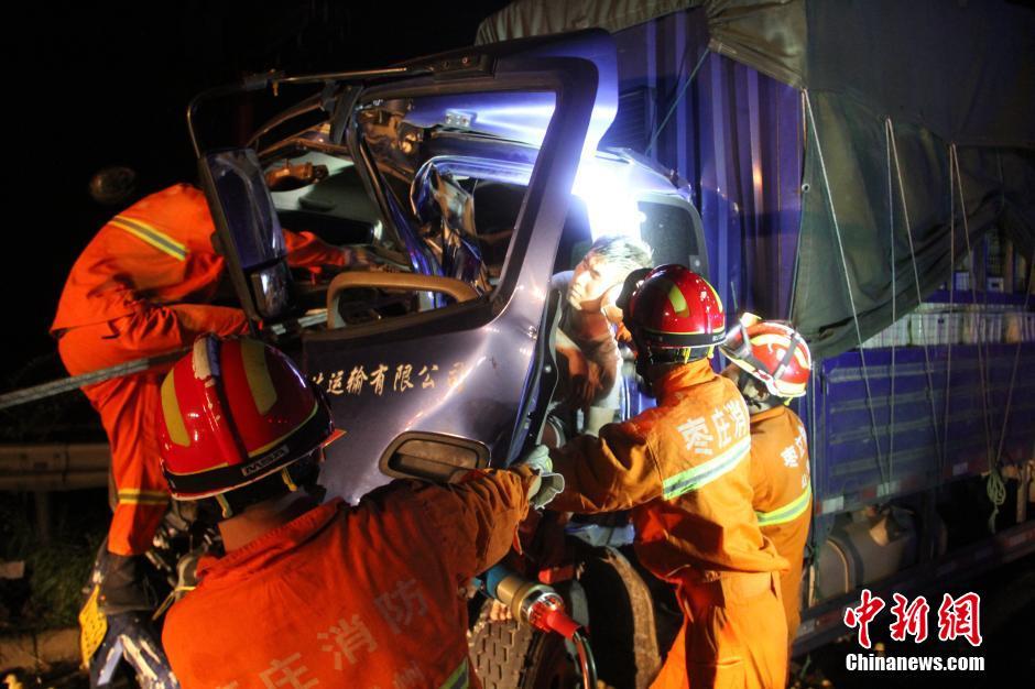 7月26日凌晨,在京臺高速滕北出口往南路段發(fā)生一起車禍,一輛裝滿鴨苗的廂貨車與半掛車發(fā)生追尾,車上3人被困,數(shù)千只鴨苗散落在高速路上。山東省棗莊市滕州消防大隊接到報警后迅速出動,對高速路面上的鴨苗進行了驅(qū)趕,疏通高速交通,及時營救出車上被困人員。中新社發(fā) 季龍 攝 圖片來源:CNSPHOTO