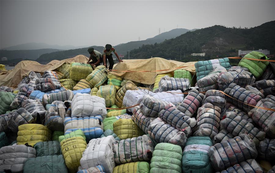 廣東邊防總隊(duì)深圳市邊防支隊(duì)近日偵破一起團(tuán)伙走私舊服裝大案,打掉一個(gè)專業(yè)走私舊服裝的犯罪團(tuán)伙,抓獲犯罪嫌疑人6名,并在涉嫌從香港走私“洋垃圾”到內(nèi)地的“利運(yùn)達(dá)號(hào)”貨船上查繳舊服裝、帆布等549噸,案值約1100萬(wàn)元。圖為8月9日,邊防戰(zhàn)士查看繳獲的舊衣物。 新華社記者 毛思倩 攝 圖片來(lái)源:新華網(wǎng)