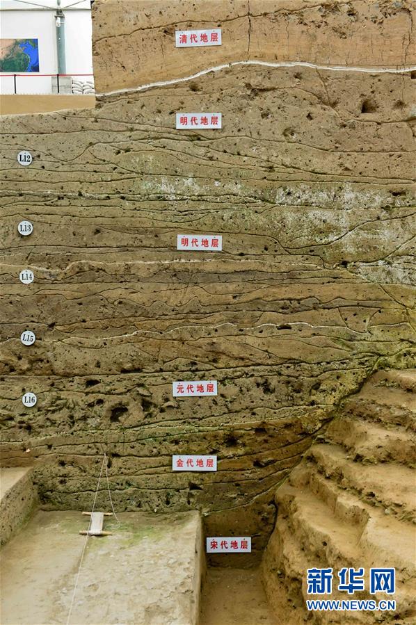 8月25日,在河南省開(kāi)封市新鄭門(mén)遺址發(fā)掘現(xiàn)場(chǎng),考古人員已揭露出宋代至清代10多層密集疊壓在一起的道路。