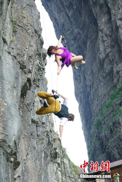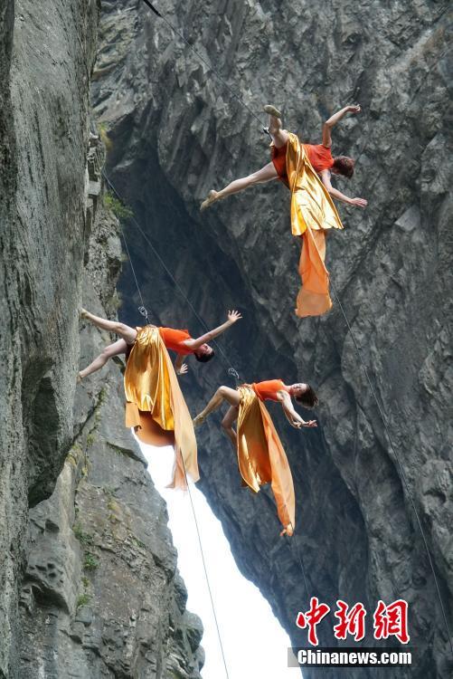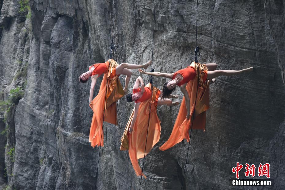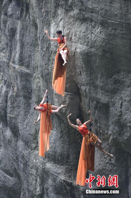 9月13日,美國(guó)BANDALOOP高空舞蹈團(tuán)在湖南張家界天門(mén)山的懸崖絕壁間盡情展現(xiàn)“垂直舞蹈”的藝術(shù)與魅力,其優(yōu)雅而驚險(xiǎn)的舞姿與鬼斧神工般的自然奇景融合、互動(dòng),吸引了不少游客駐足欣賞。中新社發(fā) 向韜 攝