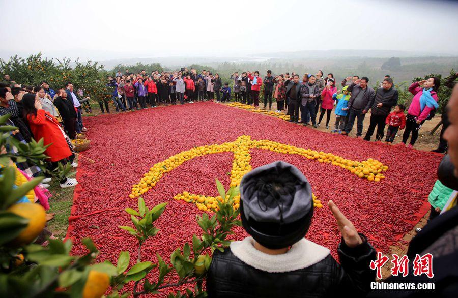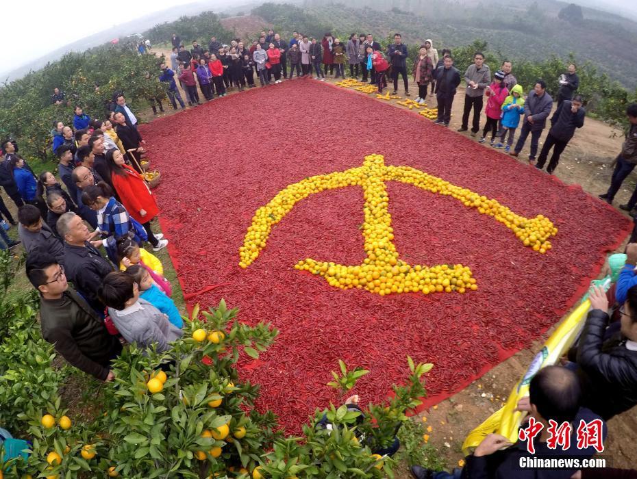 11月6日,南水北調(diào)中線工程水源地——河南淅川丹江大觀苑,滿園的桔子喜獲豐收,枝頭上碩果累累,多位農(nóng)民在桔子地里用豐收的金黃桔子和當(dāng)?shù)氐奶禺a(chǎn)紅辣椒拼成鮮艷奪目的巨幅黨旗。一位農(nóng)民告訴記者,為了拼這幅圖案,他們十幾個人整整用了兩天時間。吳揚(yáng) 攝