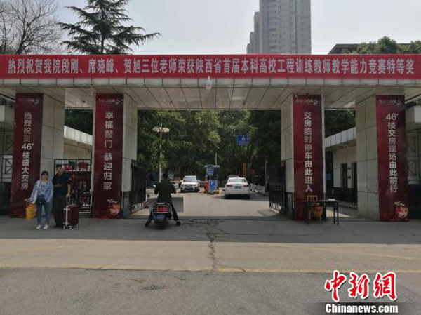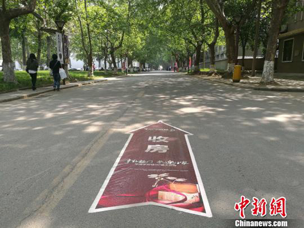校園內(nèi)貼有收房指示路標(biāo)。記者4月27日在西安建筑科技大學(xué)華清學(xué)院看到,華清學(xué)府城與該校緊鄰,中間有一道門可以進(jìn)出。樓盤交房廣告標(biāo)語張貼于學(xué)校大門的門柱上,寫有“交房臨時(shí)停車由此進(jìn)入”、“46#樓交房現(xiàn)場由此前行”、“熱烈祝賀46#樓盛大交房”等標(biāo)示。