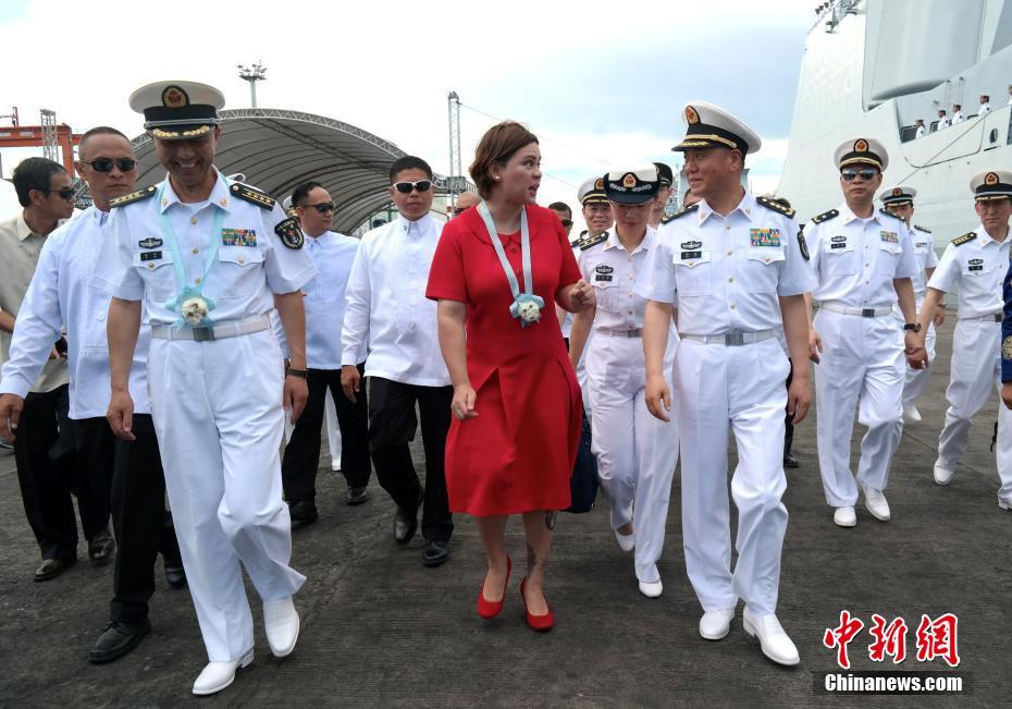 中國海軍政委苗華與達沃市長薩拉·杜特爾特女士交談。 中新社記者 張明 攝