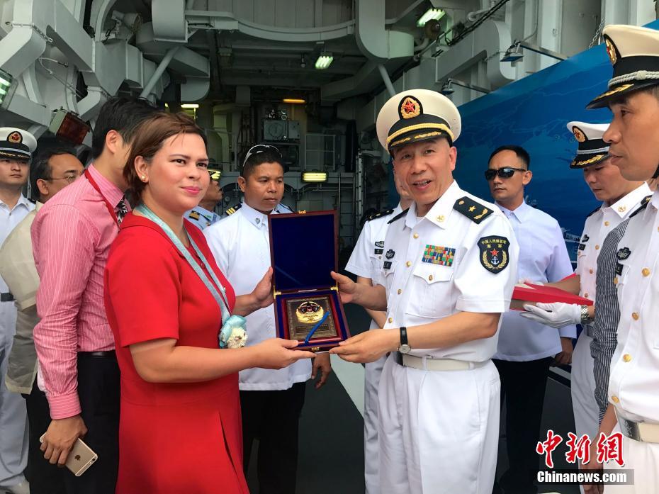 中國海軍艦艇編隊指揮員沈浩少將向登艦參觀的達沃市長薩拉·杜特爾特女士贈送紀念品。 中新社記者 張明 攝