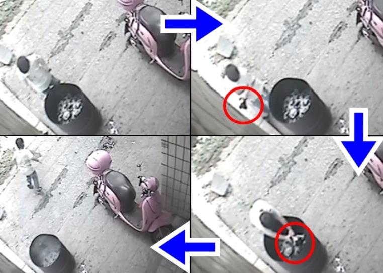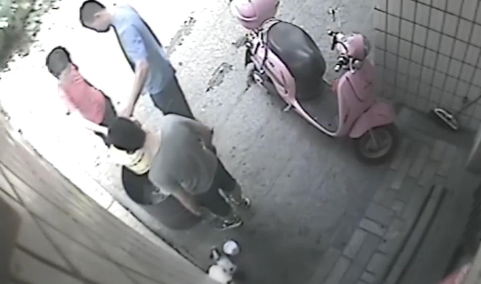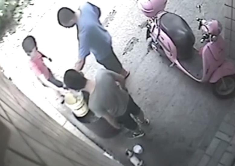 “然后我們以為那個(gè)小狗,那個(gè)桶那么高,它怎么能跳進(jìn)去。然后我們就調(diào)監(jiān)控,發(fā)現(xiàn)是鄰居家小孩做的。”圖為男童抓起小狗將其扔進(jìn)火盆。