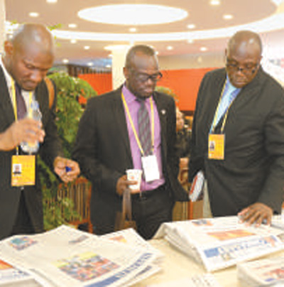 外國記者在十九大新聞中心翻閱報紙,了解十九大新聞。 人民視覺 |