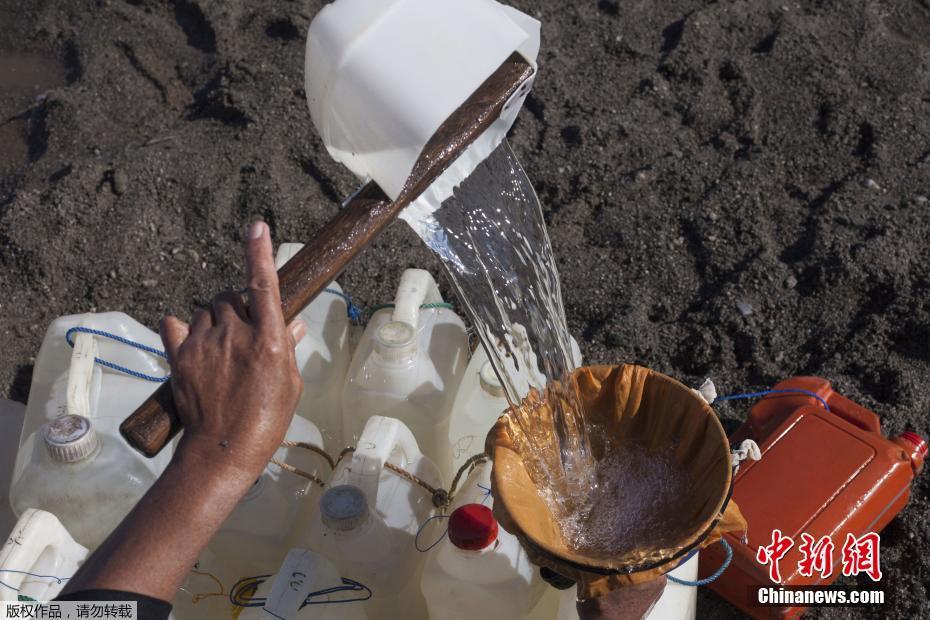當(dāng)?shù)貢r間2018年3月21日, 印尼西蘇拉威西省Tinambung,村民Mama Hasria和其他當(dāng)?shù)嘏悦刻毂澈笙抵s200個空壺子逆流而上,到河上游為他們的社區(qū)打干凈的水。
