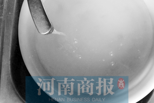 進(jìn)入一居民家后,居民迫不及待地打開水龍頭。河南商報(bào)記者看到,剛從水龍頭里接出來(lái)的水確實(shí)像面湯一樣白稠,放置半分鐘后,水開始變清,再過一段時(shí)間,接水盆盆底開始顯現(xiàn)出一層紅色的沙子。
