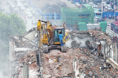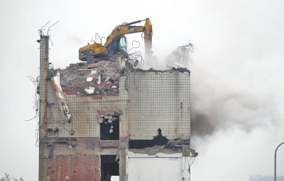 一輛拆遷機械正在對建筑進行粉碎,揚塵滿天飄散。