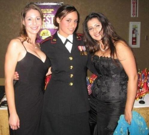 她參軍后,穿著禮服與女伴們合影。