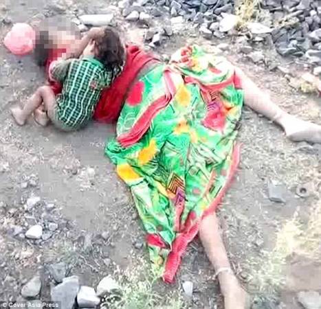 2017年5月25日?qǐng)?bào)道,印度中央邦,當(dāng)?shù)鼐旖拥綀?bào)警稱,在鐵軌附近發(fā)現(xiàn)一具尸體。當(dāng)警察趕到現(xiàn)場(chǎng)時(shí)發(fā)現(xiàn),一名17個(gè)月大的嬰兒趴在母親身上一邊痛哭,一邊正在試圖喝奶。