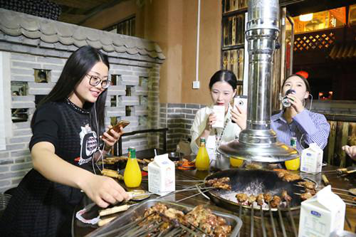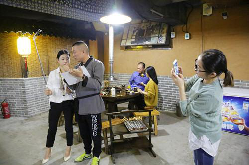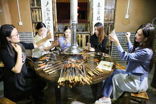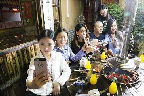 在岳家水滸烤肉店里,主播們剛剛坐下直播,就吸引來了在店里消費的其他顧客,肉都顧不上吃了,求合影,求關注……