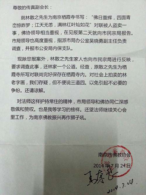 7月24日,傳真法師收到一封南京市佛教協(xié)會的回函?;睾Q,除了傳真法師報案外,林散之家人也向市民宗局反映,要求調查此事,還林家一個公道。