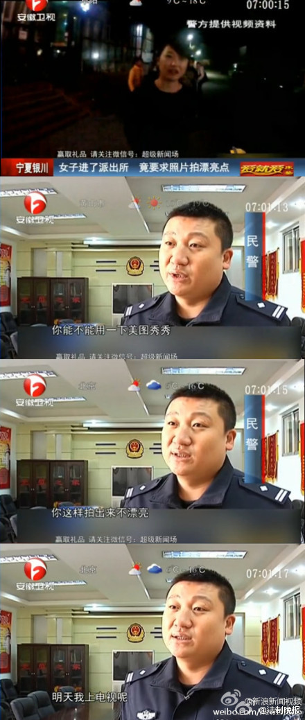人民網(wǎng)北京11月4日電 據(jù)寧夏回族自治區(qū)公安廳官方微博消息,日前,寧夏銀川,一名女子因搶奪執(zhí)法記錄儀,阻撓執(zhí)法被警察帶走。民警在審訊室準備對其拍照時,女子竟然要求民警用美圖軟件,聲稱:“你這樣拍出來不漂亮,明天我上電視吶。”