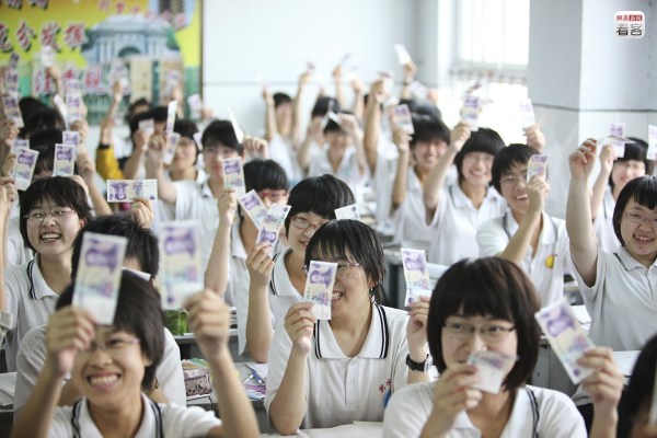 學校的另一項解壓措施是發(fā)放“回頭錢”,向每名學生發(fā)兩張五元紙幣,寓意“五谷豐登”、“十全十美”。圖為2012年6月3日,一位老師拿著一沓新紙幣準備發(fā)給學生。