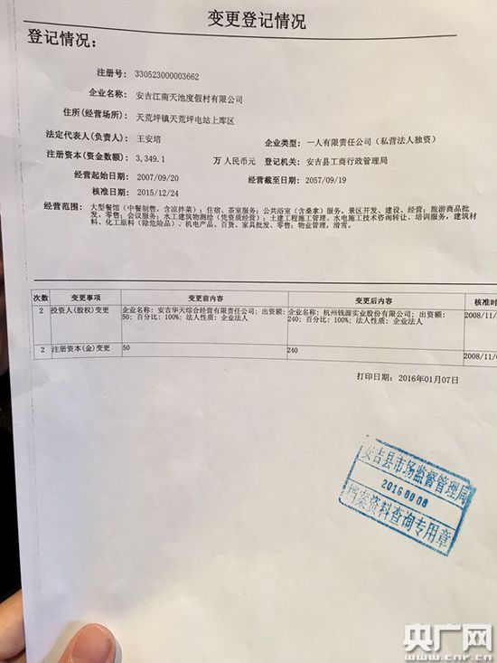 對此,王安培在接受記者采訪時稱,自己在2009年退休前,的確是電站工會主席,但江南天池公司和電站沒有關(guān)系:“我退休之前是電站的工會主席,09年退休,之前是不能搞三產(chǎn)的,這個我們是有規(guī)定的。10年推我當(dāng)董事長,變更法人成我的。錢源是我們退休的老同志,大家出點錢,在杭州注冊了一家錢源公司,拿了一點錢在安吉搞了一個江南天池度假村,和原來的三產(chǎn)沒有延續(xù)。”