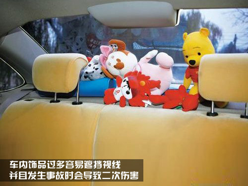 有許多車主喜歡用玩偶、抱枕等飾品裝飾愛車,這些其實是個很雞肋東西,既遮擋了視線,發(fā)生事故時又會導致二次傷害。抱枕相對于一些硬質的玩偶還算好一些,僅僅會遮擋駕駛員視線,然而那些硬質的玩偶,在發(fā)生碰撞時,它的隨意性是很大的,說不準打到誰。所以,還是不要在車內放置過多的雜物,干凈整潔才是王道。