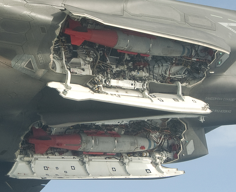 3月2日,美國洛-馬公司生產(chǎn)的F-35B BF-03試驗(yàn)機(jī)加掛兩枚JDAM制導(dǎo)炸彈升空試飛。試飛過程中,F(xiàn)-35B開啟隱藏式彈艙玩起橫滾機(jī)動。圖為-35B BF-03隱藏式彈艙細(xì)節(jié)。