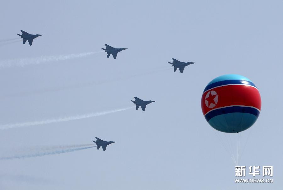 4月15日,戰(zhàn)斗機(jī)在朝鮮首都平壤舉行的閱兵式上進(jìn)行表演。當(dāng)日,朝鮮在金日成廣場(chǎng)舉行盛大閱兵式,慶祝金日成誕辰100周年。朝鮮國(guó)家最高領(lǐng)導(dǎo)人金正恩出席閱兵式并發(fā)表演講。 新華社記者張利攝